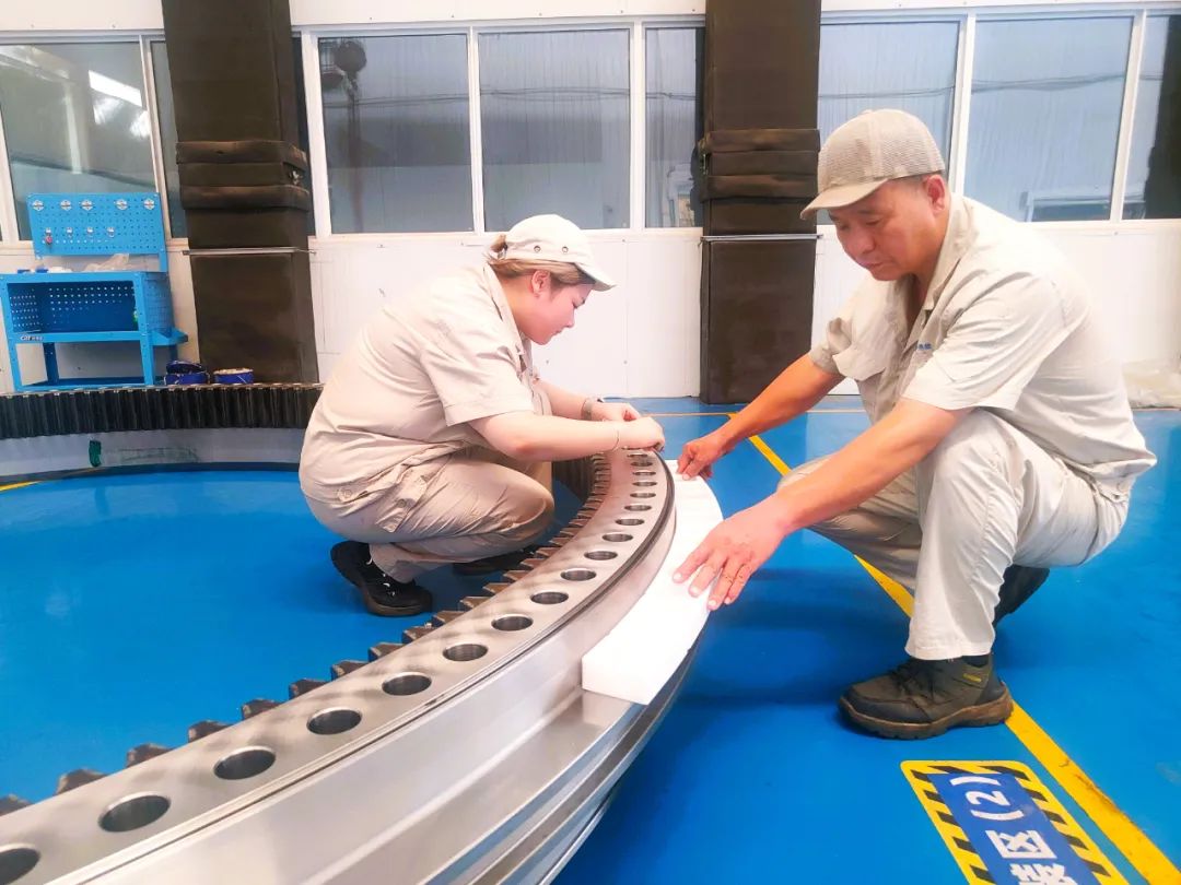 此次,洛軸為其批量配套的產(chǎn)品主要應(yīng)用于風(fēng)機(jī)的偏航、變槳兩個(gè)部位,其產(chǎn)品外徑尺寸最大達(dá)到5.6m,單重超過(guò)13噸。為確保產(chǎn)品順利研發(fā),洛軸研發(fā)生產(chǎn)團(tuán)隊(duì),針對(duì)產(chǎn)品使用工況特殊要求,結(jié)合前期積累的研發(fā)制造經(jīng)驗(yàn),運(yùn)用新工藝、新技術(shù),確保產(chǎn)品順利加工。尤其是針對(duì)變槳軸承淬火工藝要求高,內(nèi)圈徑向滾道為凹槽型,加工難度大等問(wèn)題,運(yùn)用獨(dú)創(chuàng)加工方法,反復(fù)試驗(yàn),不斷攻堅(jiān),最終滿(mǎn)足徑向滾道淬硬層符合要求,還兼顧提升了軸向滾道淬火后與擋邊交界處質(zhì)量。同時(shí),加工過(guò)程中,洛軸還對(duì)徑向滾道直線(xiàn)性及粗糙度等進(jìn)行了嚴(yán)格的質(zhì)量管控,確保了產(chǎn)品裝配一次合套成功。
